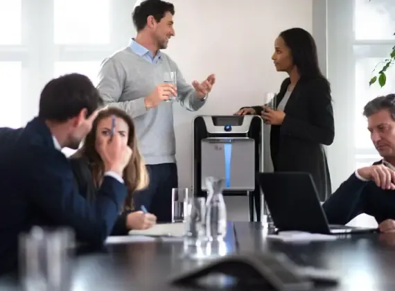 En nuestros dispensadores de agua fría y caliente conectados a la red, la purificación se apoya en tecnologías como filtración por carbón activo, protección antimicrobiana BioCote® y sistemas Firewall® UVC, lo que permite ofrecer agua de alta calidad para el consumo diario en espacios laborales.